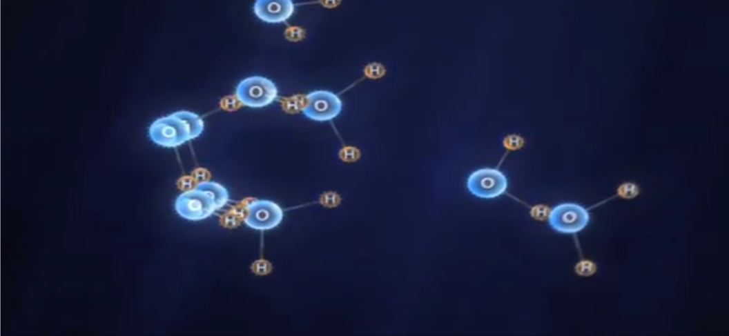 Water molecules, (and there are three types of water; normal, heavy and superheavy .. but for now I don’t think this is important), are like a magnet with two different ends or poles. The positive, hydrogen end of one water molecule will attract to the negative oxygen ends of other water molecules.