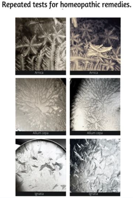 “My process was to add a couple of drops of a certain remedy into specifically collected, pristine spring water, and then I’d freeze it using my method of short term crystallography.”