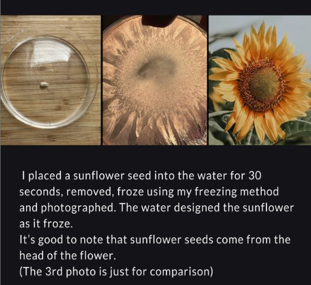 Veda noticed a structural improvement to the tap water after holding the melted tap water petri dish to her heart lovingly. She froze it again after and observed that the tap water's structure had improved.