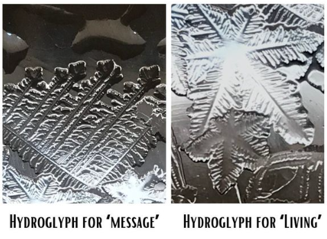 Veda Austin in exploring water consciousness created something called hydroglyphs, which are symbols frozen in ice that have one or more meaning. She calls them the language of water. When she asked water what is a hydroglyph it replied in hydroglyphs saying living messages.