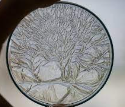 To make a crystalline ice picture you just need a glass petri dish, she has 10cm dishes but mine are smaller. She uses two tablespoons of water, (spring water best but try different waters), if you have a smaller dish you need less water. The best results are small amounts of water and flash freeze the water. Her dish takes four and a half minutes and she sets her phone timer (it is easy to miss the time). You want to take the water out when it is only slightly set and there is a layer of water on the top. You take it out of the freezer, tip the top water away and hold up the dish and take a picture on your phone before it starts melting. It does take a while to get the right time and amount of water, just play with the water and as Veda would say, create a relationship with the water and see what happens!