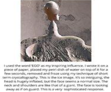 Veda discovered that water is much more interested in how someone is feeling rather than what they are thinking. If she is sad it might design sad faces rather than what she is wanting it to do and if she is feeling hurried or frustrated then the crystallography won’t design any crystal pictures at all. A friend showed her a photo in the frozen water of a dog, her dog had died recently and although she was trying to think about tulips and asking the water to create this image, it showed her a picture instead of her dog, as she was feeling the sadness of the loss of her much loved dog.